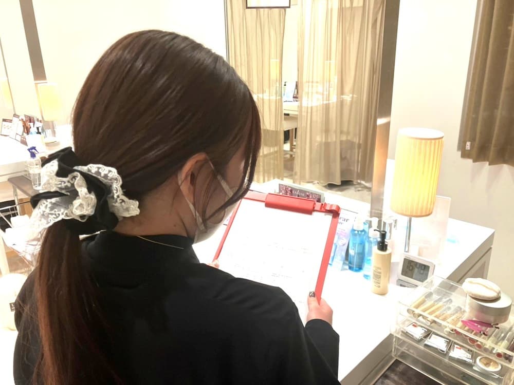 お客様のお悩みやご希望が記載されたカウンセリングシートをもとに、ご希望や仕上がりイメージをヒアリングしながら骨格に合わせた眉をご提案します。